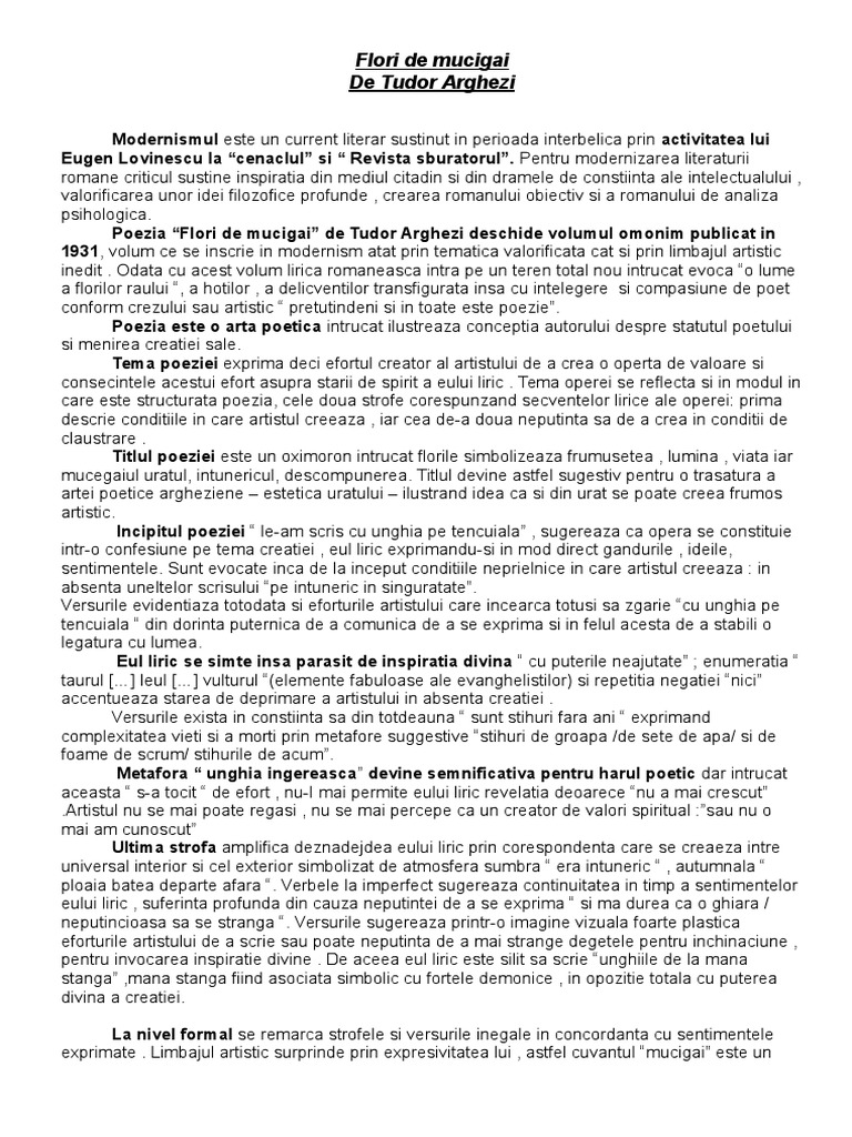 Sinteza Bac Romana Flori De Mucigai Tudor Arghezi