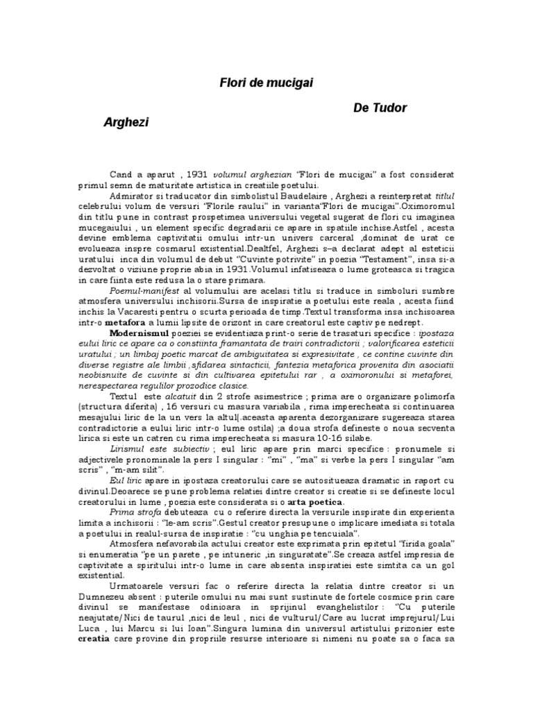 Flori De Mucigai Docx Poet Cu O Activitate Literara Indelungata Si Deosebit De Bogata Tudor Arghezi Se Inscrie Deopotriva In Traditie Si In Course Hero